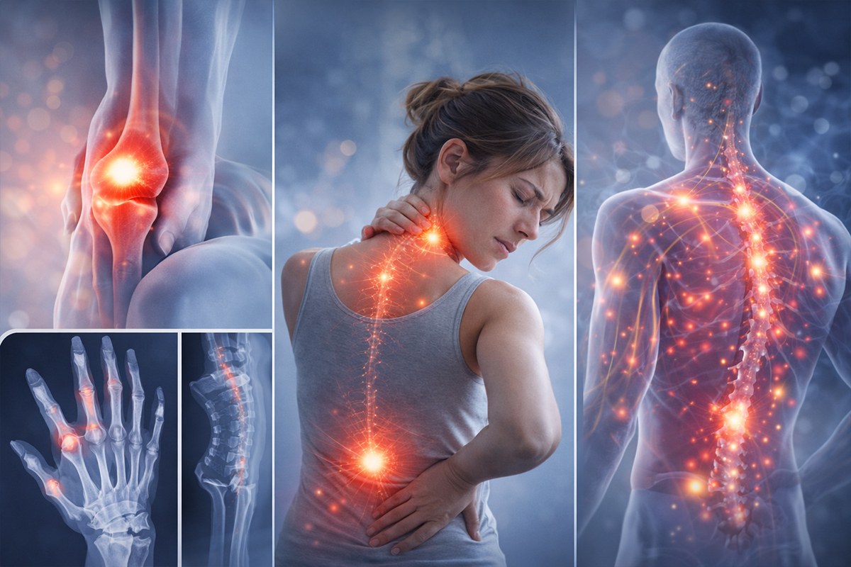 Yaygın ağrılar, eklem ağrıları, eklem şişliği, hareket güçlüğü gibi sorunlar, ilk planda Romatizmal sorunları akla getirir. Son yıllarda bilinirliği oldukça artmış olduğundan, akla gelen bir diğer konu ise Fibromiyaljidir.